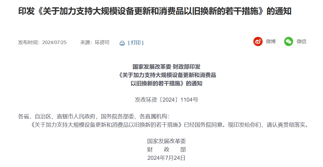 7月25日消息,国家发展改革委、财政部印发《关于加力支持大规模设备更新和消费品以旧换新的若干措施》(以下简称《措施》)的通知,统筹安排3000亿元左右超长期特别国债资金,加力支持大规模设备更新和消费品以旧换新。