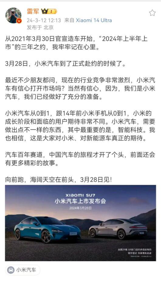 “从2021年3月30日官宣造车开始,‘2024年上半年上市’的三年之约,我牢牢记在心里。3月28日,小米汽车到了正式赴约的时候了。”