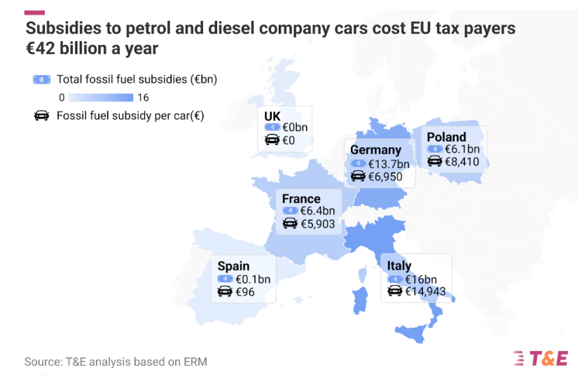 车能方程式讯 据路透社报道,根据欧洲环保组织运输与环境(T&E)委托咨询公司环境资源管理(ERM)进行的一项研究,欧盟五大成员国每年花费约420亿欧元(约合456亿美元)补贴化石燃料企业用车(在欧洲,企业用车约占新车总销量的60%),这与欧盟的绿色转型议程相悖。T&E因此呼吁为电动汽车提供更多补贴。