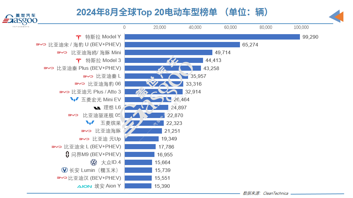 8月全球Top 20电动车型榜单:一半以上来自比亚迪