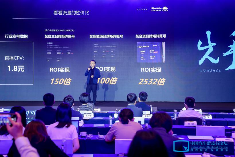 我给大家看一个真实的数据,一个自主品牌,一个经销商的直播能达到13000人观看。一个新能源品牌,大概能稳定在8000人。我们有一个合资品牌,基本上头部帐号能稳定在20万人,基本上零推广,零推广的情况下做到20万人,如果把所有的成本算上,用CPA乘以流量,可以看到他的SOI非常高,至少在100倍以上。
