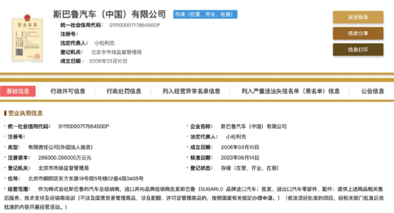 此前,富士重工业株式会社持有斯巴鲁中国 60% 股权,庞大集团持有斯巴鲁中国 40% 股权。而在庞大“退出”后,斯巴鲁中国企业类型由有限责任公司(中外合资)变更为有限责任公司(外国法人独资)。