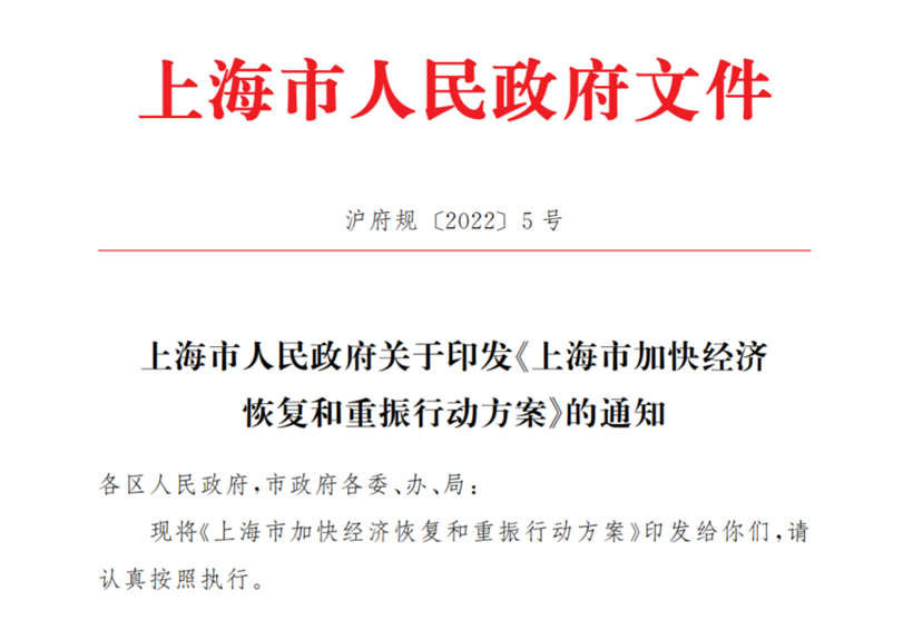 5月29日,上海市人民政府发布关于印发《上海市加快经济恢复和重振行动方案》(以下简称为《方案》)的通知。