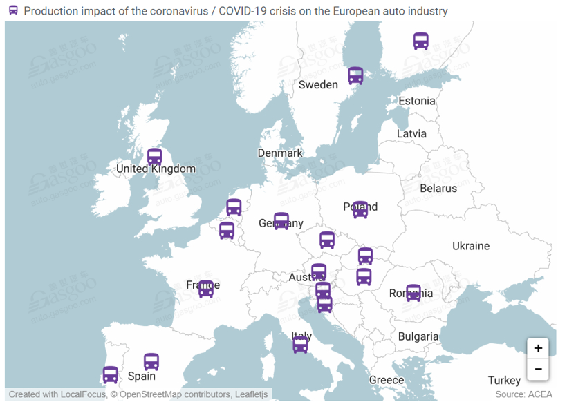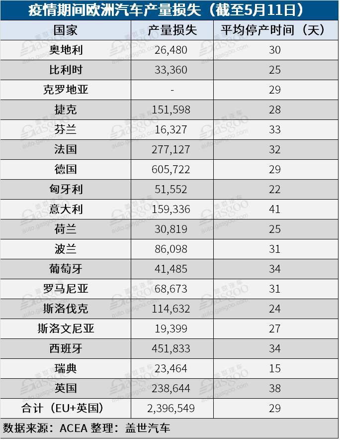 新冠疫情对欧洲汽车业的影响还在继续。根据欧洲汽车工业协会(ACEA)整理的数据,从3月中旬至5月11日,欧盟范围内因疫情关闭工厂造成的产量损失已达2,396,549辆(包括乘用车、轻型商务车、公交和长途汽车);平均停产时间为29个工作日。ACEA指出,如果继续停产或者再有工厂突然停产,产量损失情况将会更严重。
