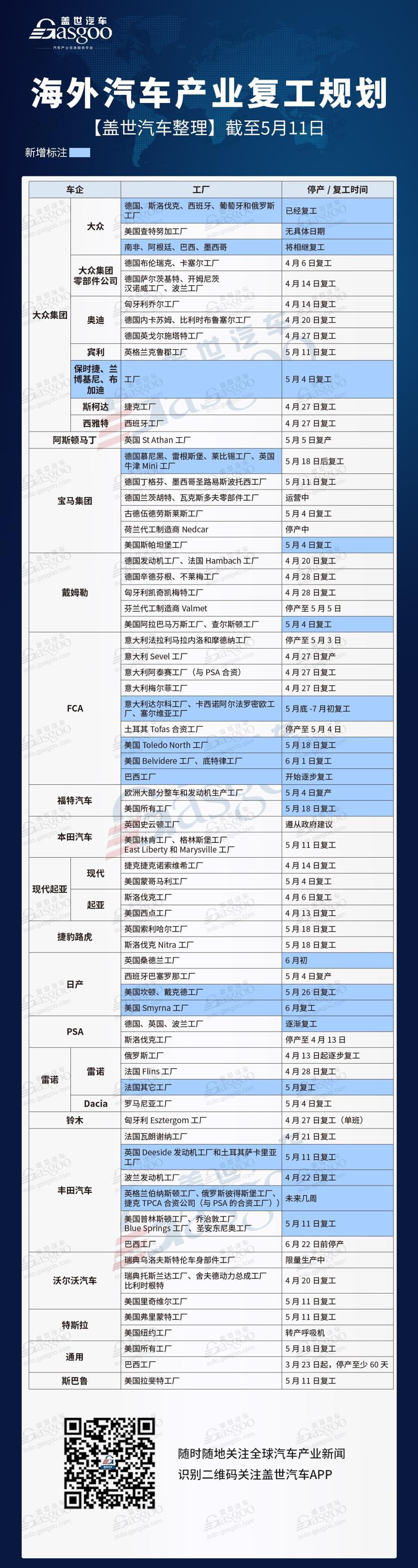 以下为车能方程式整理出的海外复工复产情况,供您参考。