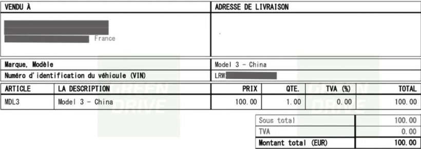 一名欧洲车主的发票显示其新车Model 3进口自中国(图片来源:Greendrive)