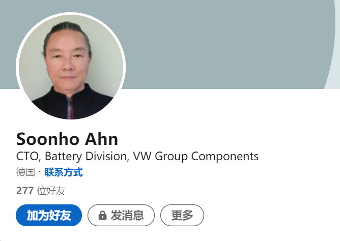 车能方程式讯 据外媒报道,苹果全球电池主管Soonho Ahn已加盟大众汽车。据悉,大众汽车雇用Ahn加盟其PowerCo电池部门。Ahn的领英资料显示,他目前担任大众汽车电池部门的首席技术官,在德国下萨克森州沃尔夫斯堡工作。
